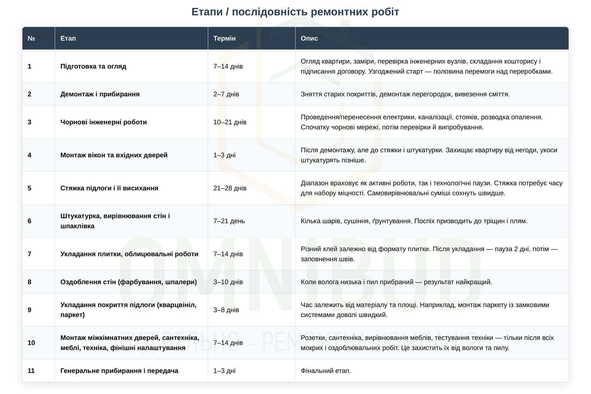 - Для великого ремонту — перепланування, перенесення або заміна інженерних мереж — додайте приблизно 2 місяці.