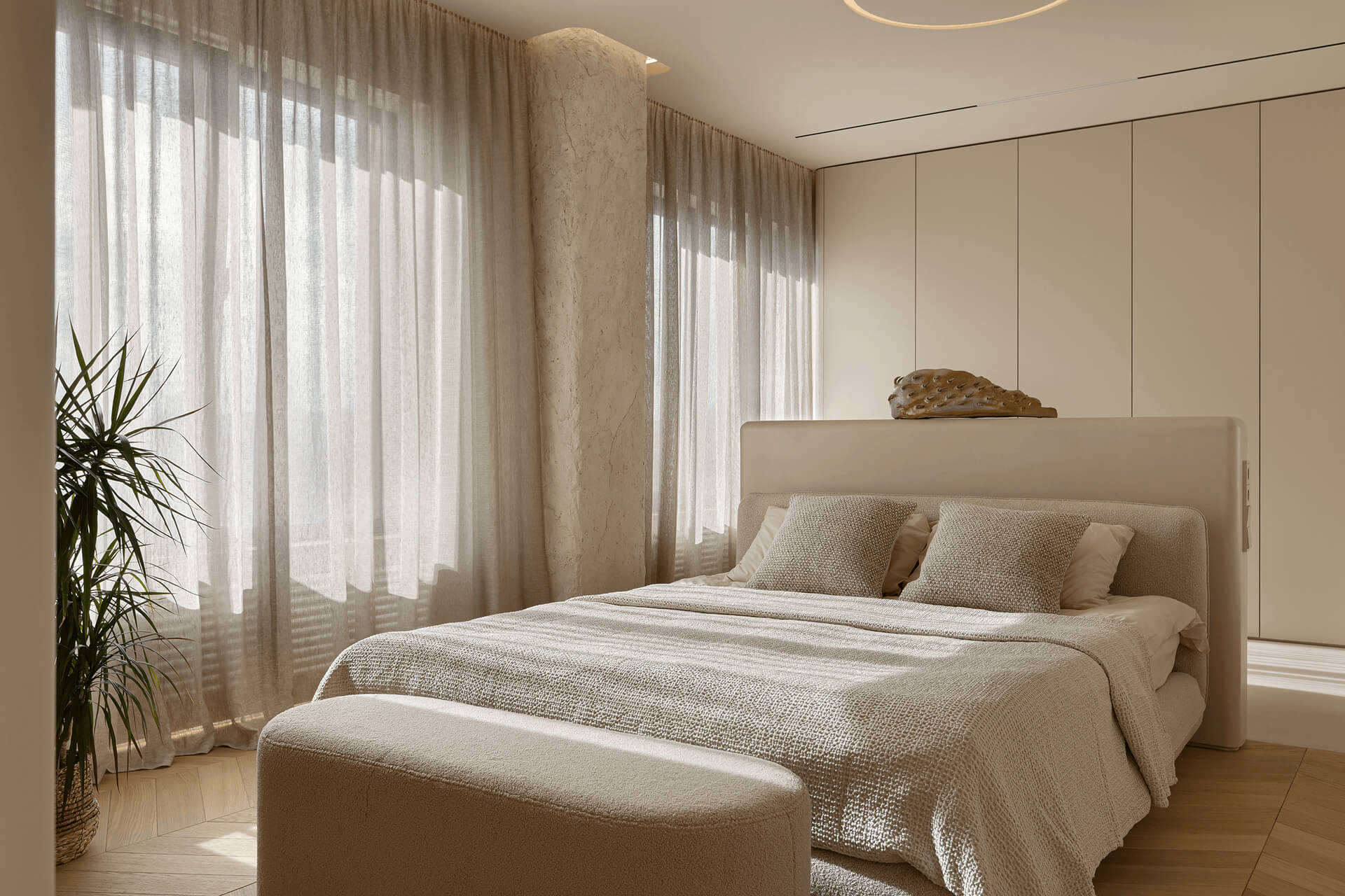 У головній спальні — ванна за узголів’ям ліжка. Округлі форми та м’яка підсвітка створюють атмосферу спа-спокою. Кімната одночасно виглядає як приватний люкс і як місце для щоденного відпочинку.