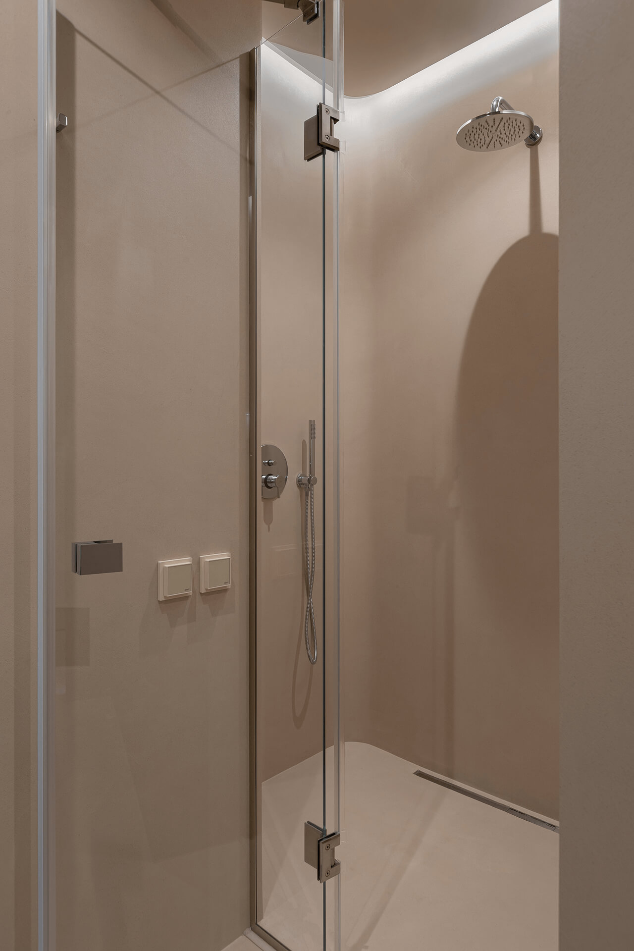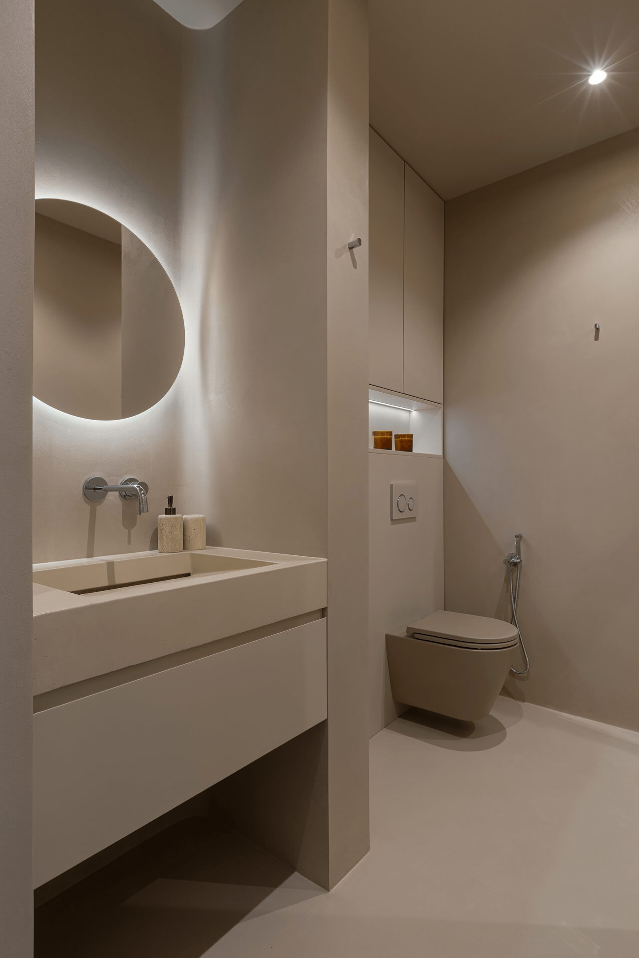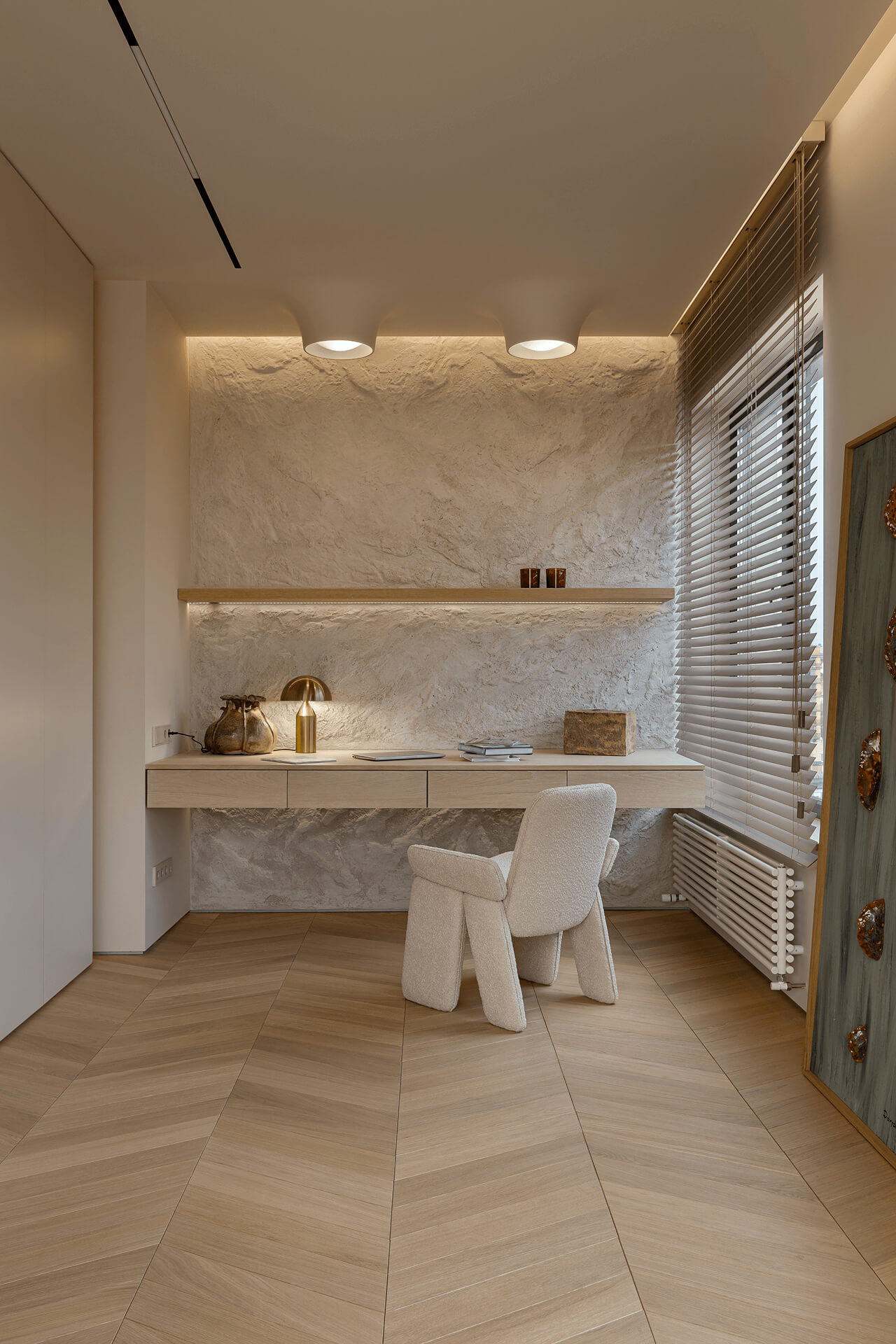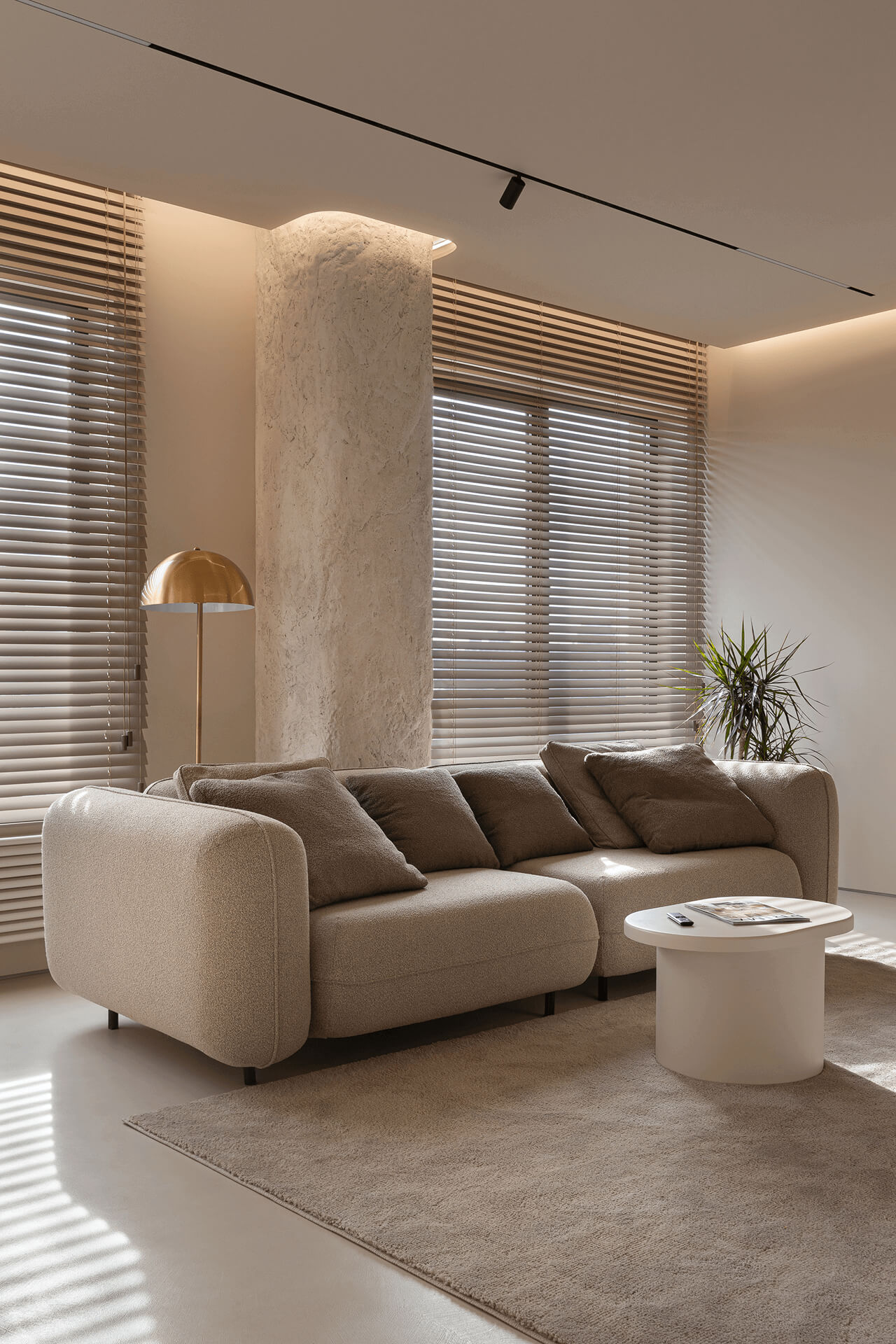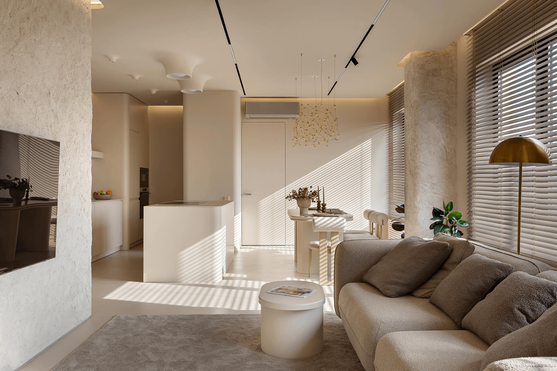 Мінімалізм, теплі бежеві відтінки, природні матеріали. Єдиний стиль у всіх приміщеннях. Початково це приміщення — нежитлове. Ми трансформували його в житлове, дотримавшись усіх будівельних норм.