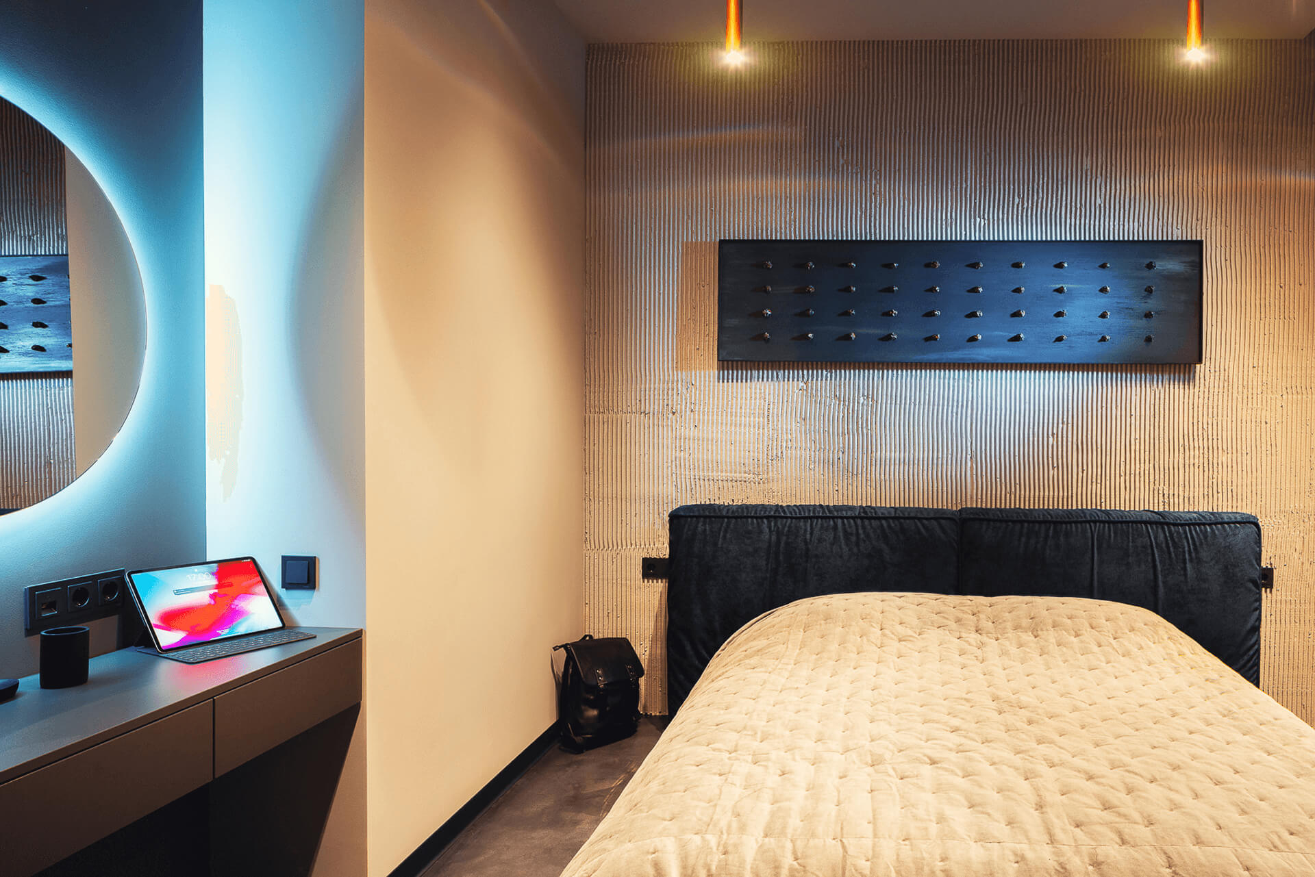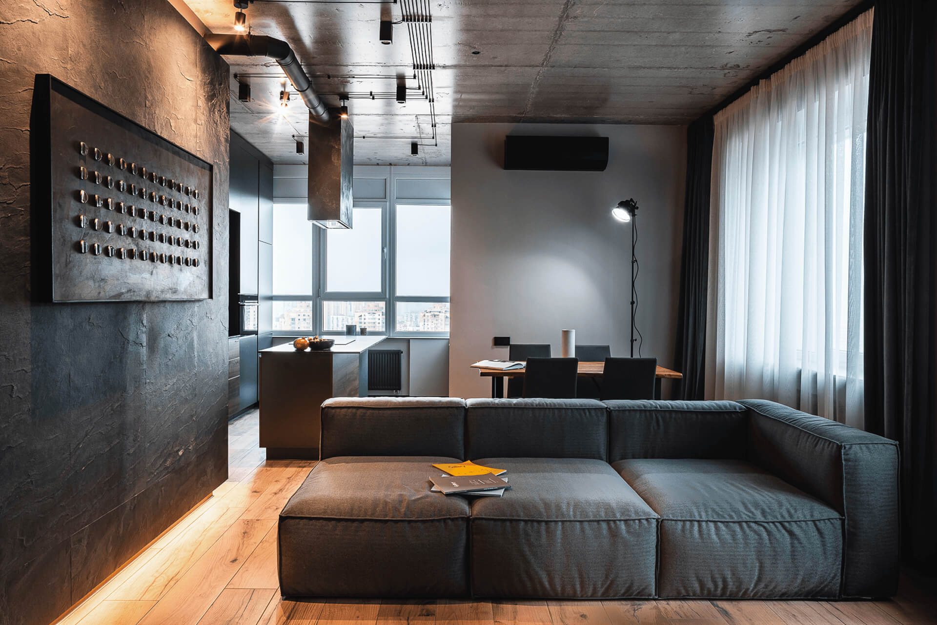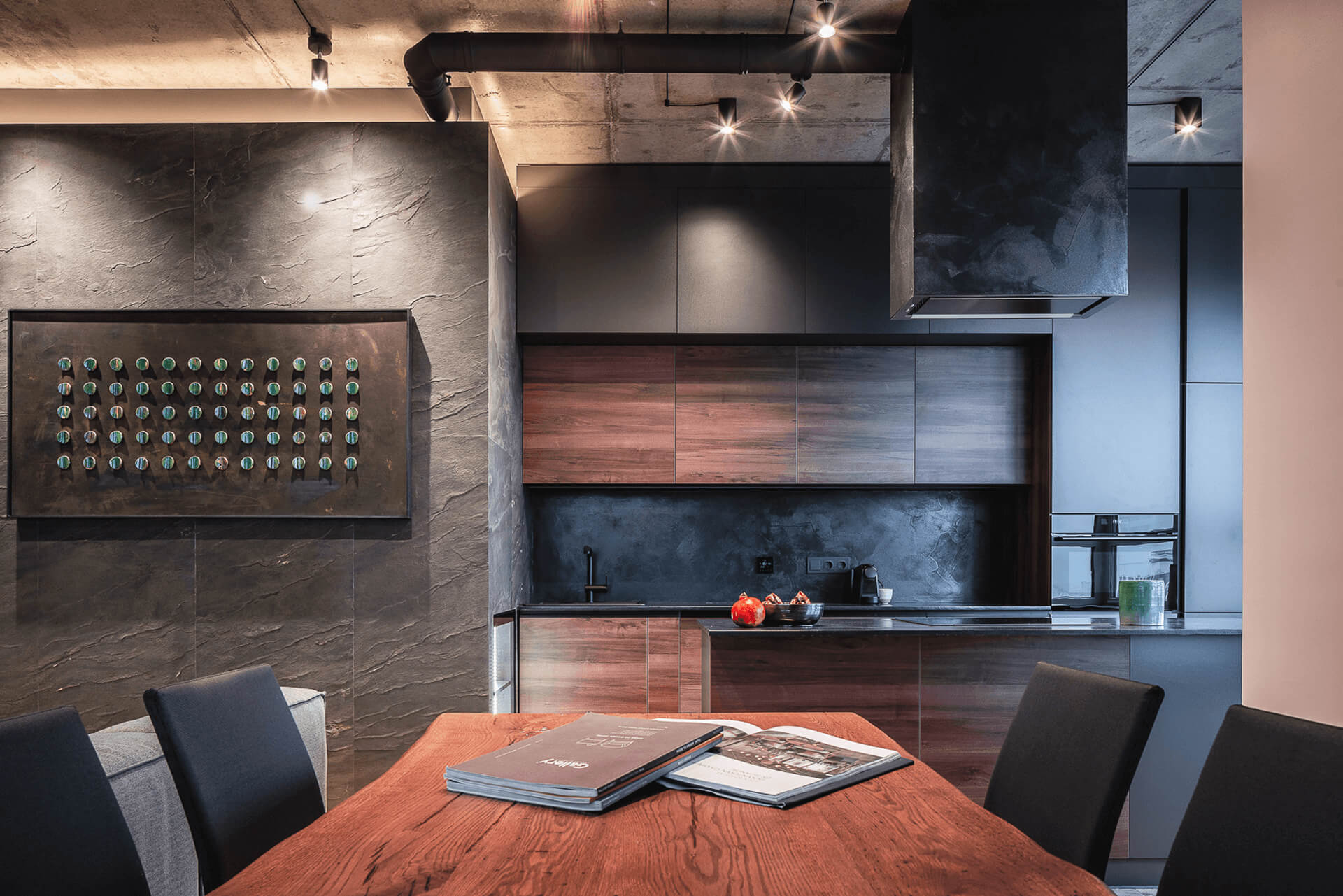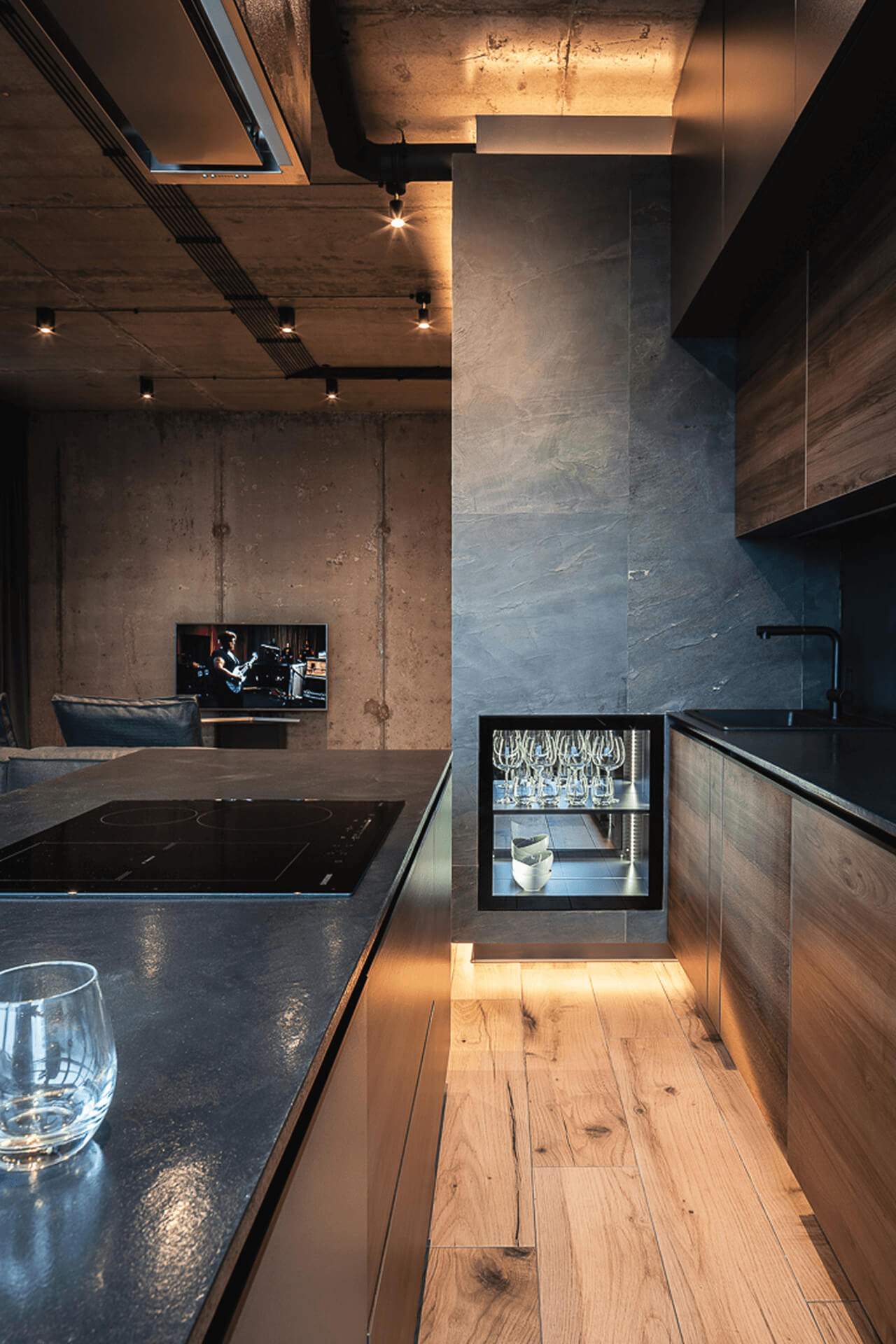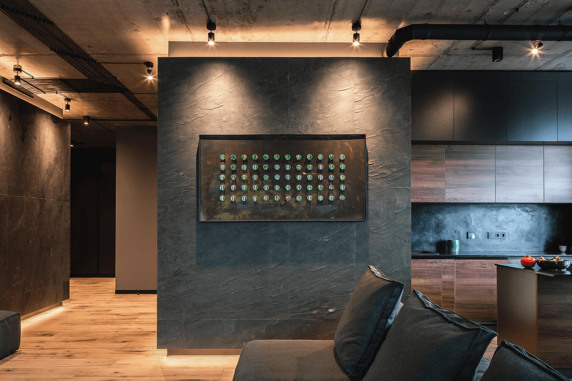 Стиль інтер’єру. Бетонні поверхні стають природними завдяки серйозним текстурам: базальту, граніту, вугіллю, вулканічній породі.Для оздоблення стін використано натуральний кам'яний шпон.