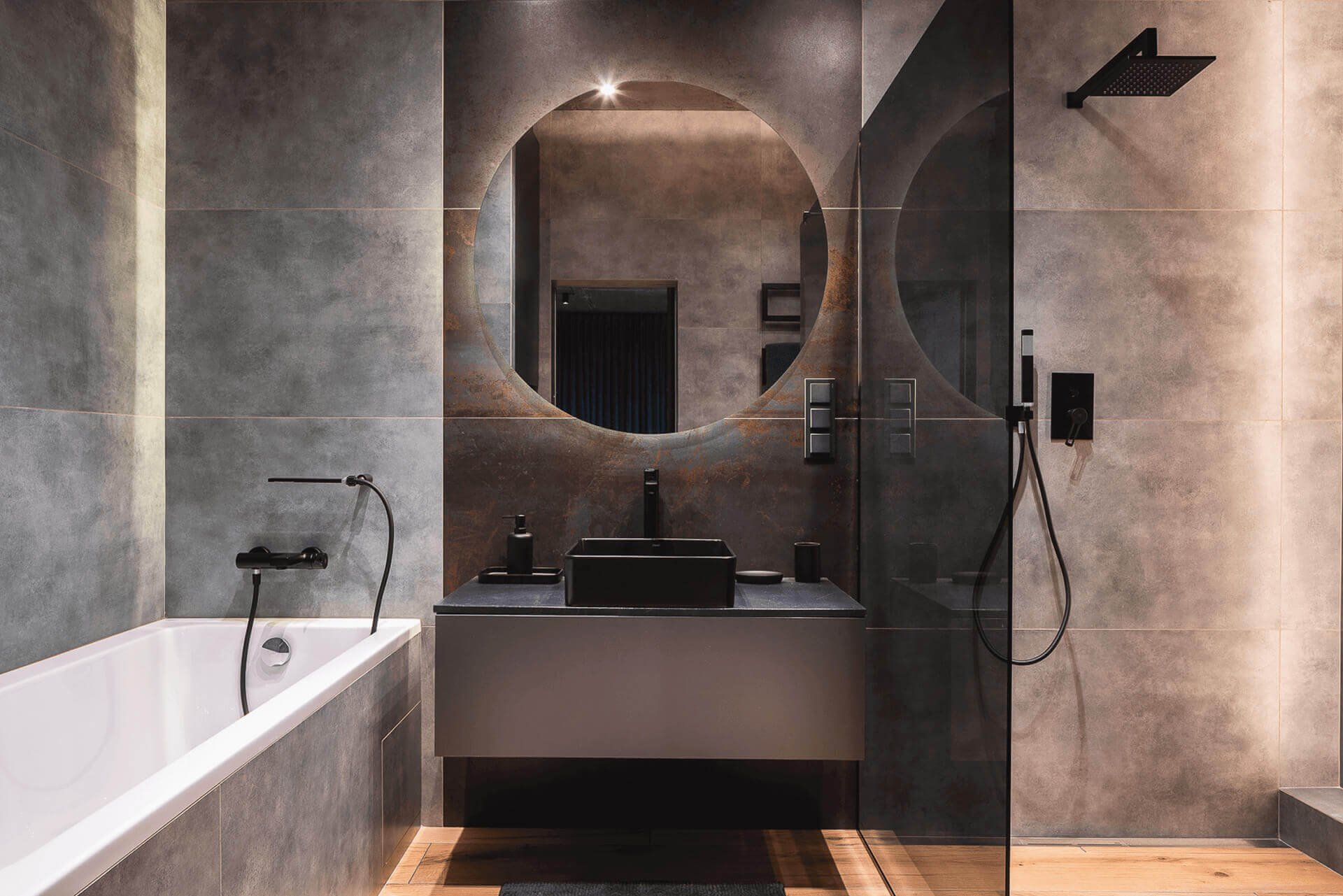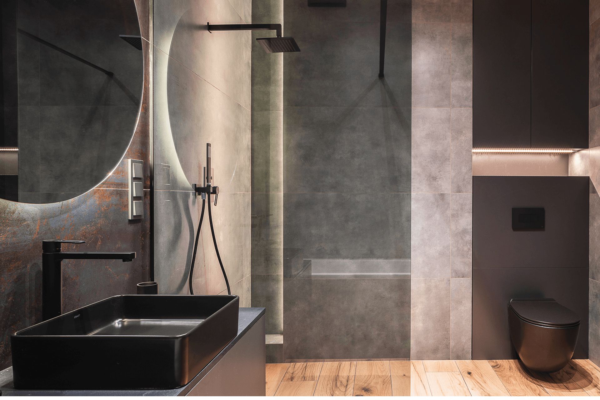 Санвузол. Мовчазний, стриманий, елегантний. Окрема ванна і душова, чорна сантехніка, плитка в бетонних відтінках. Така ванна кімната вимагає багато світла — і його вдосталь: верхні споти та LED-стрічки в передбачених нішах.
